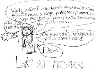 Five days after seeing it in theaters, I'm still formulating my thoughts on The Avengers. However, blogs live and breathe on their ability to be timely and of the moment, and waiting to post a review is neither of those things. With that in mind, I enlisted my cousin, who is eleven and awesome, to write a review of the film and draw pictures as well. He thankfully obliged: